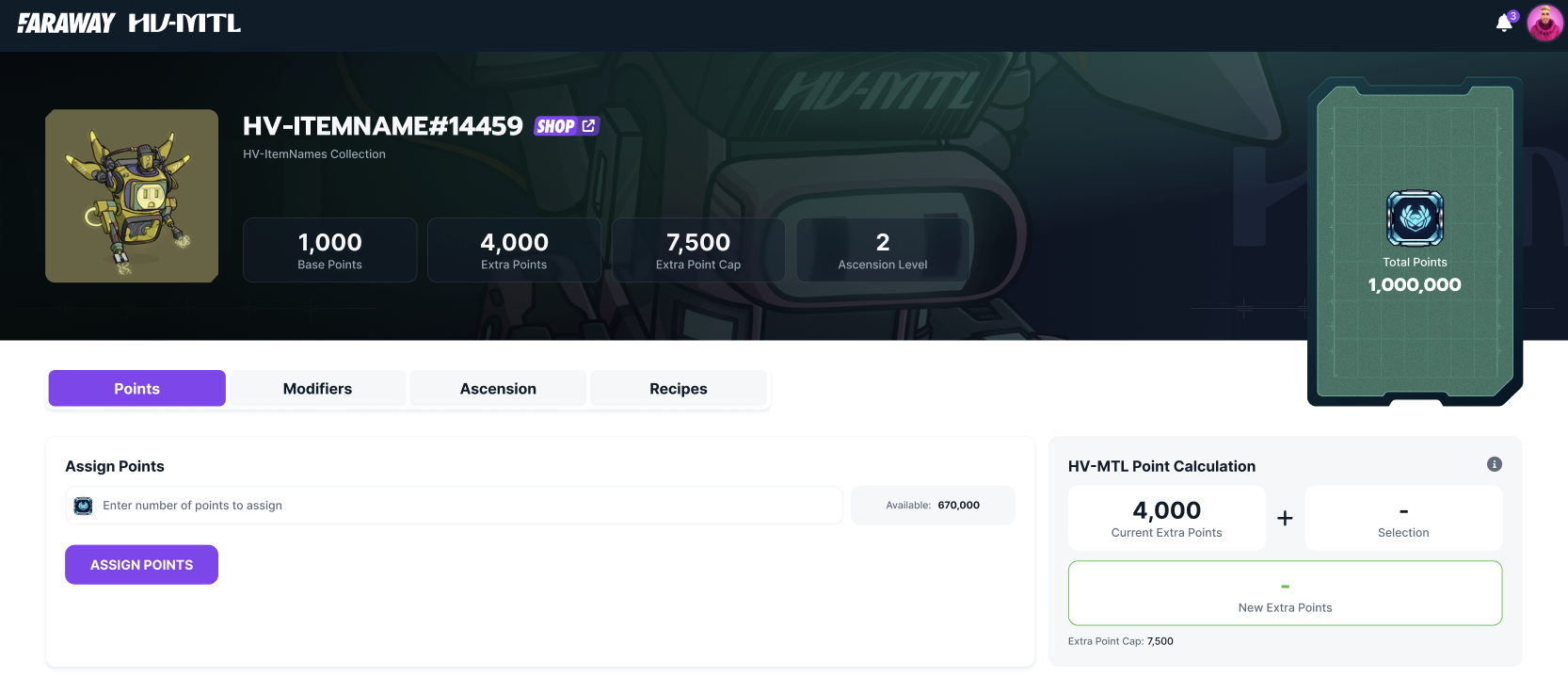 NFTs in the HV-MTL collection are assigned inherent Base Points determined by their existing metadata. Owners can earn Extra Points which can be assigned to either LOTM or HV-MTL NFTs.
