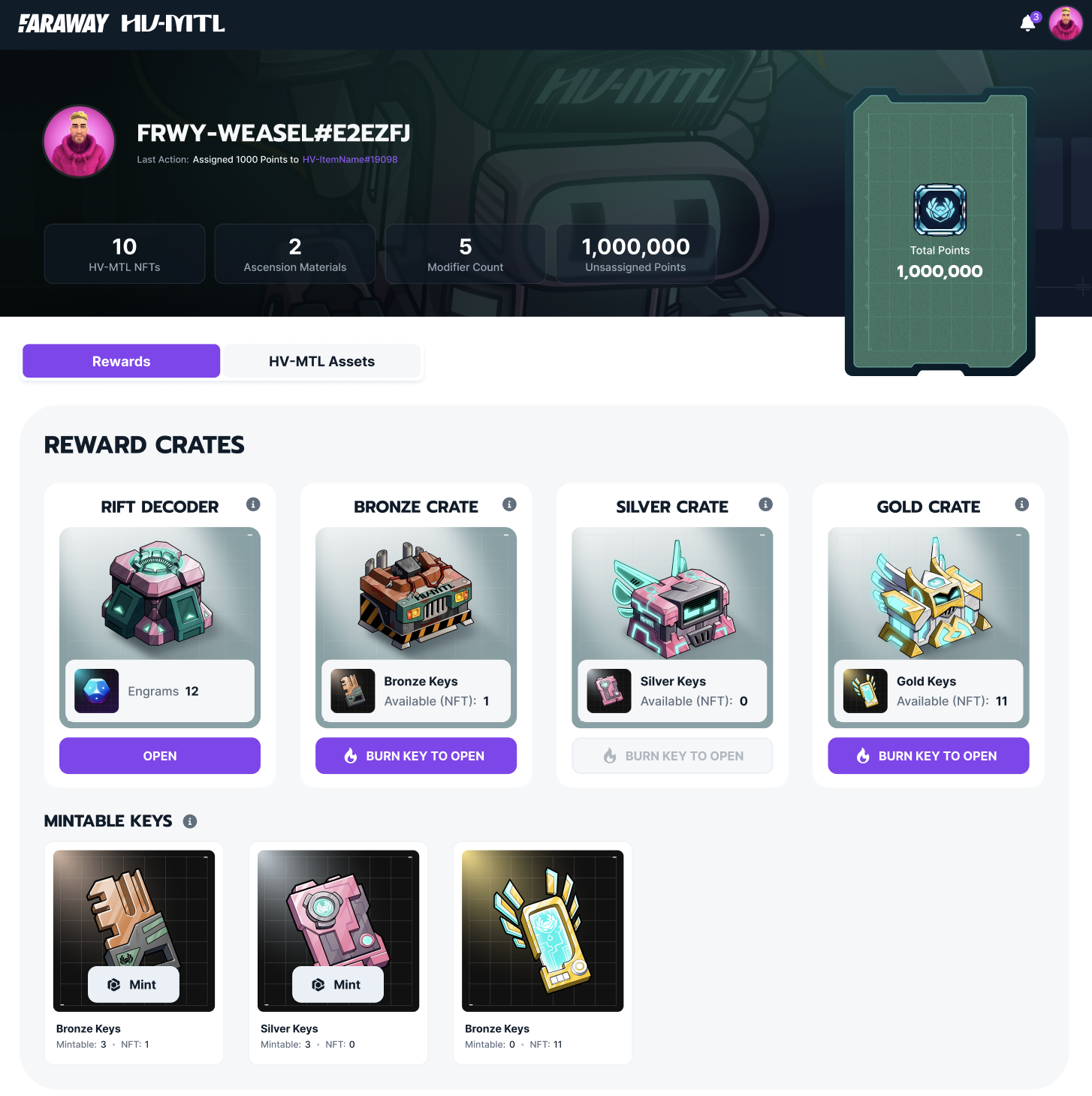 In the HV-MTL Points Portal, you can use your Engrams to open Rift Decoders. Rift Decoders will reward you with either a HV-MTL Key (bronze, silver, or gold) or in-game consumables for various Faraway games.